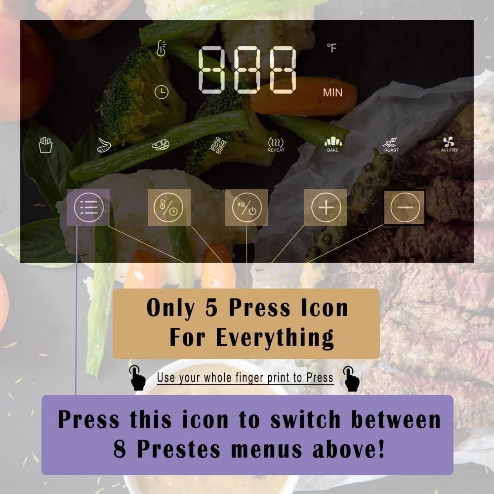 EIGHT PRESETS VERSATILE AND CUSTOMIZATION: This multi-functional elecric air frier comes equipped with 8 buttons, offering a variety of cooking options with Default Reference Temperature & Time: Four common kitchen foods and Four essential kitchen functions; With adjustable time and temperature settings, you can customize your own recipes. This feature allows you to experiment with different cooking techniques to create your own culinary food and share the joy with your family.