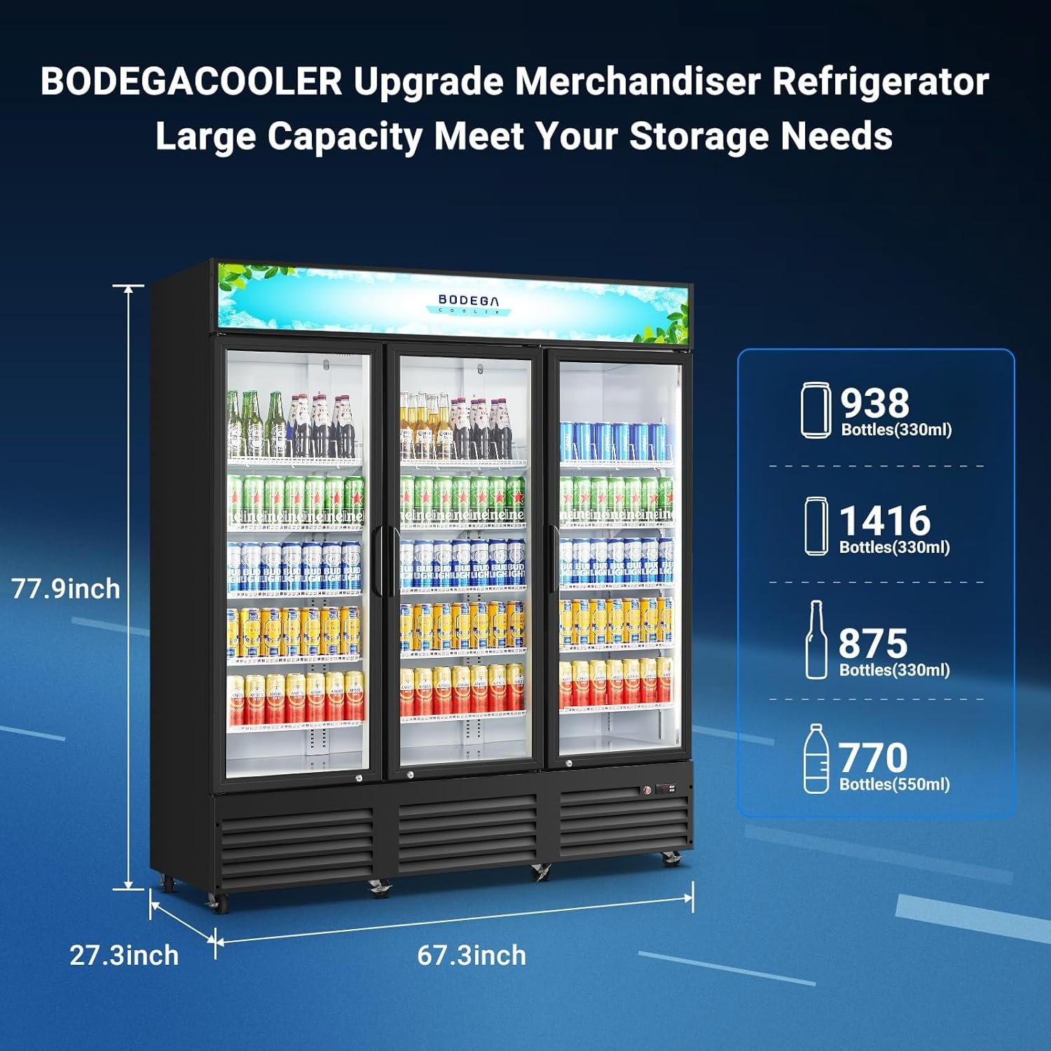 Versatile Merchandising : BODEGACOOLER three-door merchandiser refrigerator serves as a versatile merchandising solution, perfect for showcasing a wide range of products, including commercial beverage refrigerators, display refrigerators, and other commercial refrigerators. Its spacious interior allows for effective product placement and eye-catching displays. 53 Cu. Ft Merchandiser Display Refrigerator is perfect for multiple scenarios