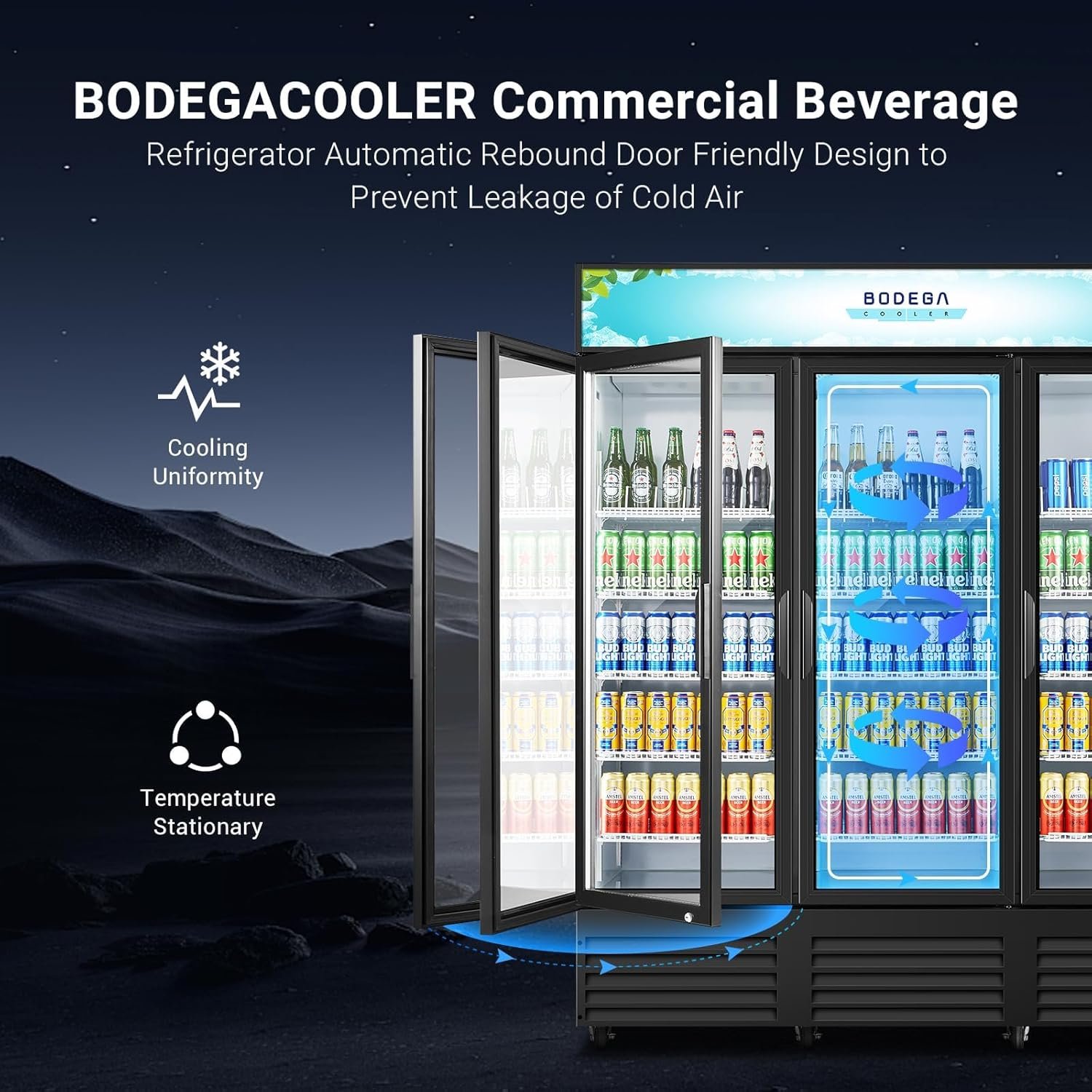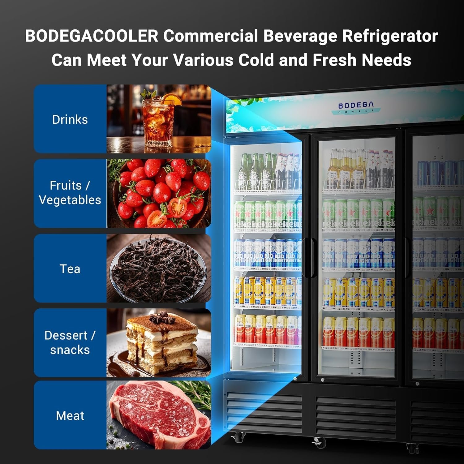 BODEGACOOLER upright beverage refrigerator is suitable for various scenarios, including but not limited to:retail stores,supermarkets and convenience stores,restaurants and cafés: bars and night clubs,offices and corporate spaces,trade shows and events,business meetings and conference venues etc.