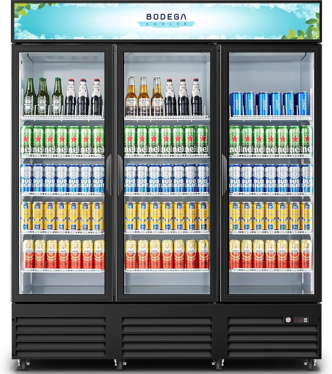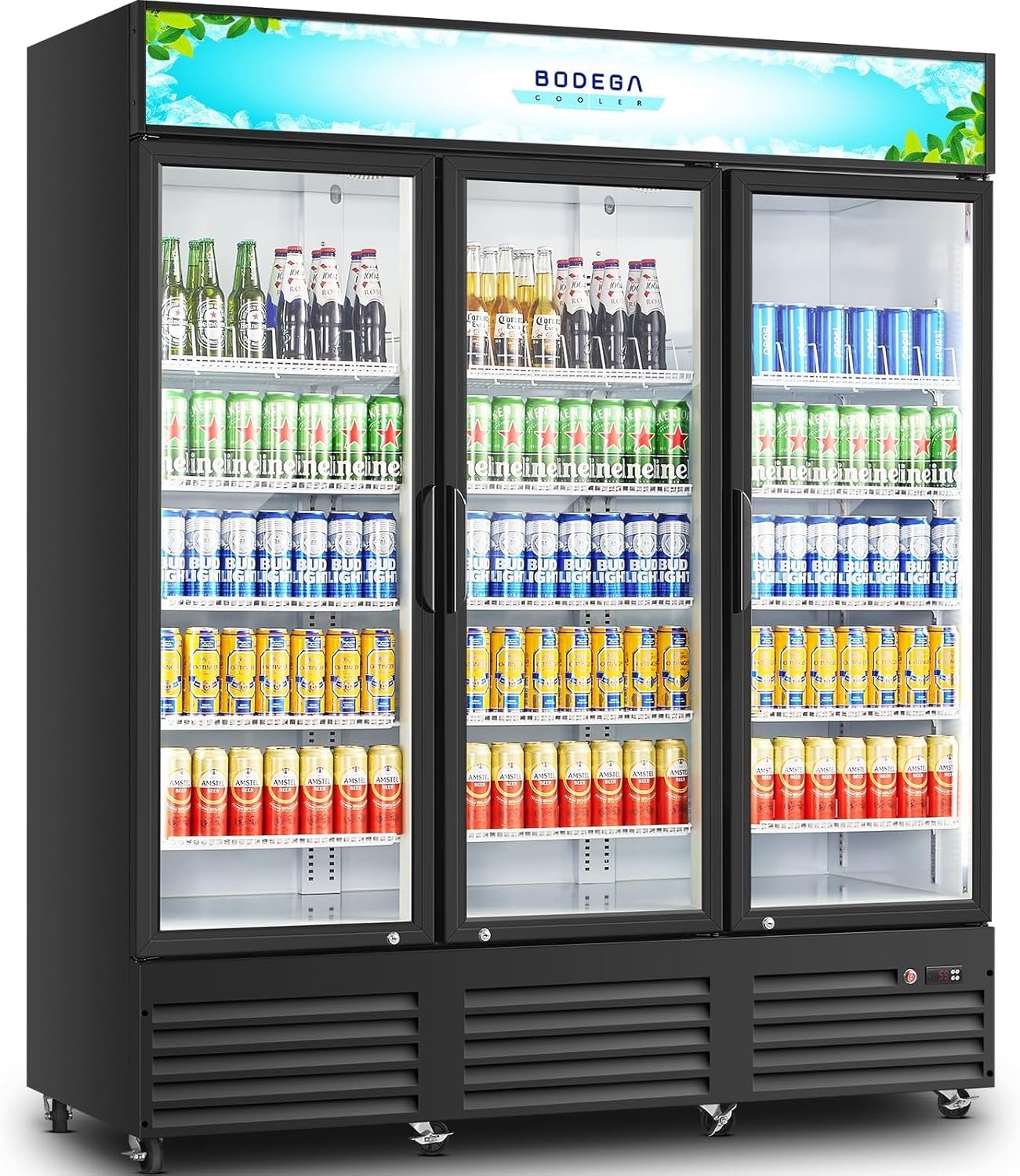 BODEGACOOLER Commercial Merchandiser Refrigerator,3 Glass Door Commercial Beverage Refrigerator, Beverage Display Cooler with Soft LED Light, Adjustable Shelves and 8 Strong Castors, 53 Cu. Ft,Black