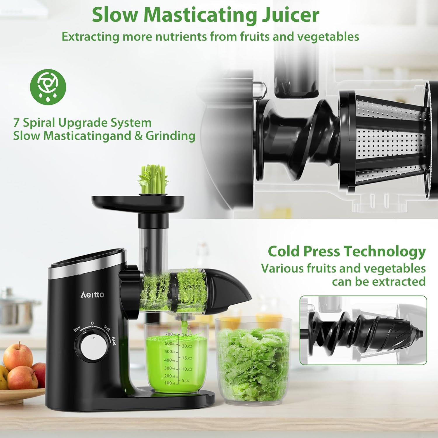 Cold Press Juicer, Aeitto Slow Juicer with Powerful Motor, Soft & Hard Modes, Reverse Function, Juicer Machines Fit All Vegetable and Fruit, Dishwasher Safe, High Juice Yield, Black
