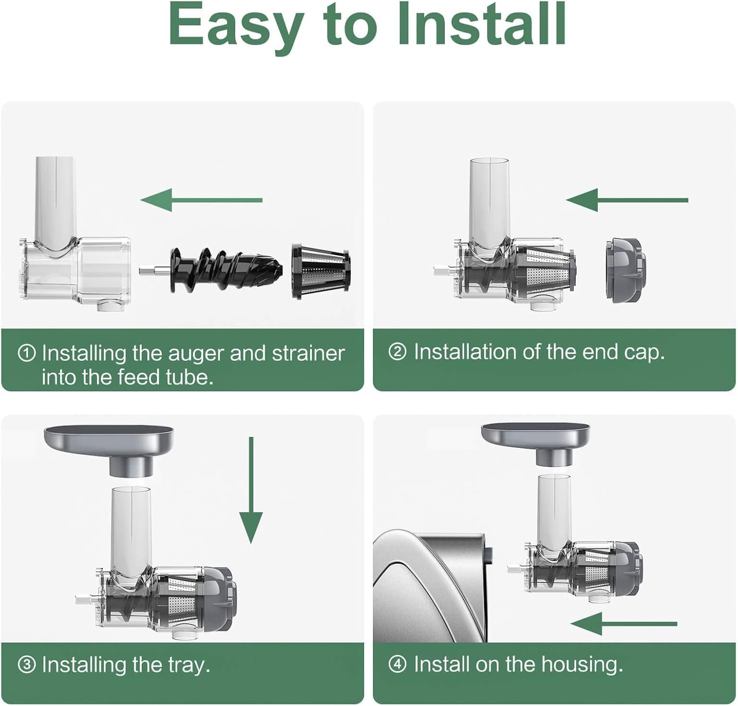 High Juice Yield & Richer Nutrition: Slow masticating juicer can perfectly separate juice and pulp, extracting higher-purity juice and preserving higher nutritional value. Our auger spins at 80 RPM , extracts up to 20% more juice and 30% more vitamins and minerals. 80 rpm lower speed means no heat build-up and less oxidation. Juice cup baffle included can also help to separate juice and pulp further.