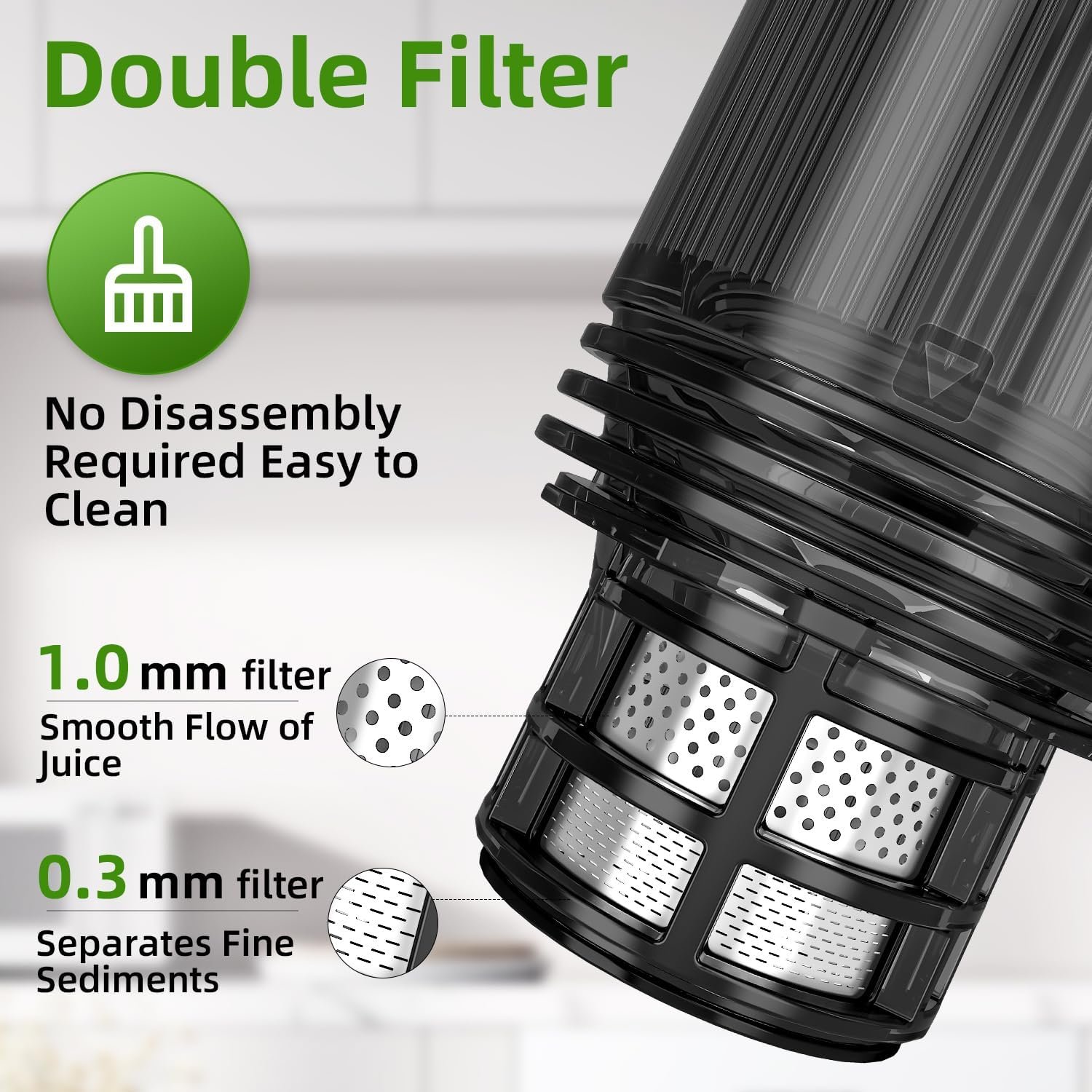 【Purer Juice】350W high efficiency juicer with precision stainless steel double-layer filter, which can thoroughly separate the fruit pomace and less sediment. The juice yield is up to 99%.