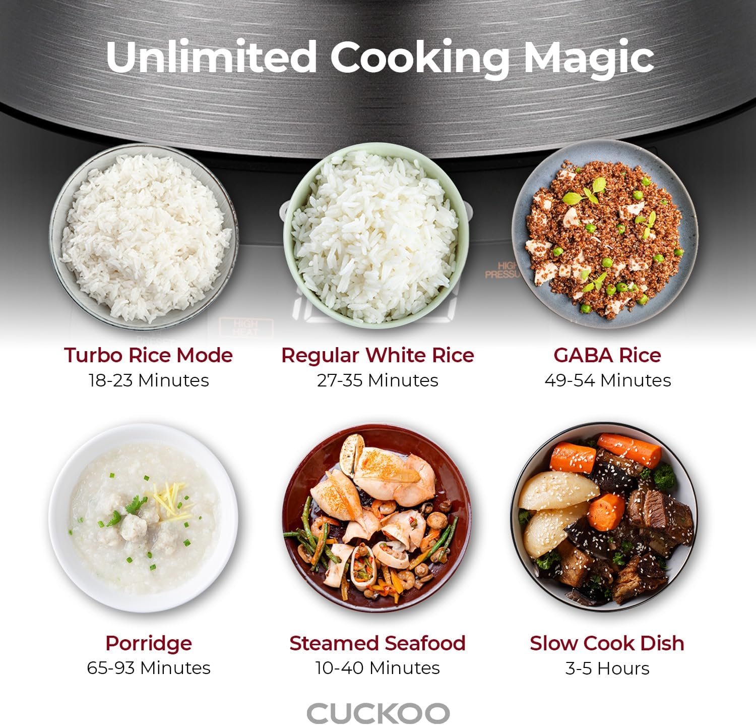 Enjoy Consistent, Delicious Rice with CUCKOO’s CRP-RT0609FB 6-Cup Twin Pressure Rice Cooker! As a Korean brand internationally known for its top-tier quality and with over 40 years of industry experience, CUCKOO guarantees all products are crafted with precision and care. With our CRP-RT0609FB rice cooker experience convenience at a large capacity. Key Features: Multi-Functional Cooking: With a variety of 14 menu options between white (glutinous) rice, scorched rice, baby food, and high pressure/non-pressure steam, a myriad of rice and meals is possible with this cooker. Twin Pressure Selections: Choose between pressure or non-pressure cooking for specific and customized results based on your own preferences. Smart Automated Technology: Included operating modes that make maintenance easier, such as a Keep Warm mode to automatically keep your rice at an optimal temperature without overcooking. 3 Language Voice Guide: Includes a voice navigation guide in English, Chinese, and Korean, this rice cooker will act as your personal kitchen assistant! Hassle-Free Cleaning: The unit comes with an inner lid to easily remove and clean to ensure rice will still taste great, even after continuous use. Serve rice quickly and easily with CUCKOO’s CRP-RT0609FB 6-Cup Twin Pressure Rice Cooker in no time!
