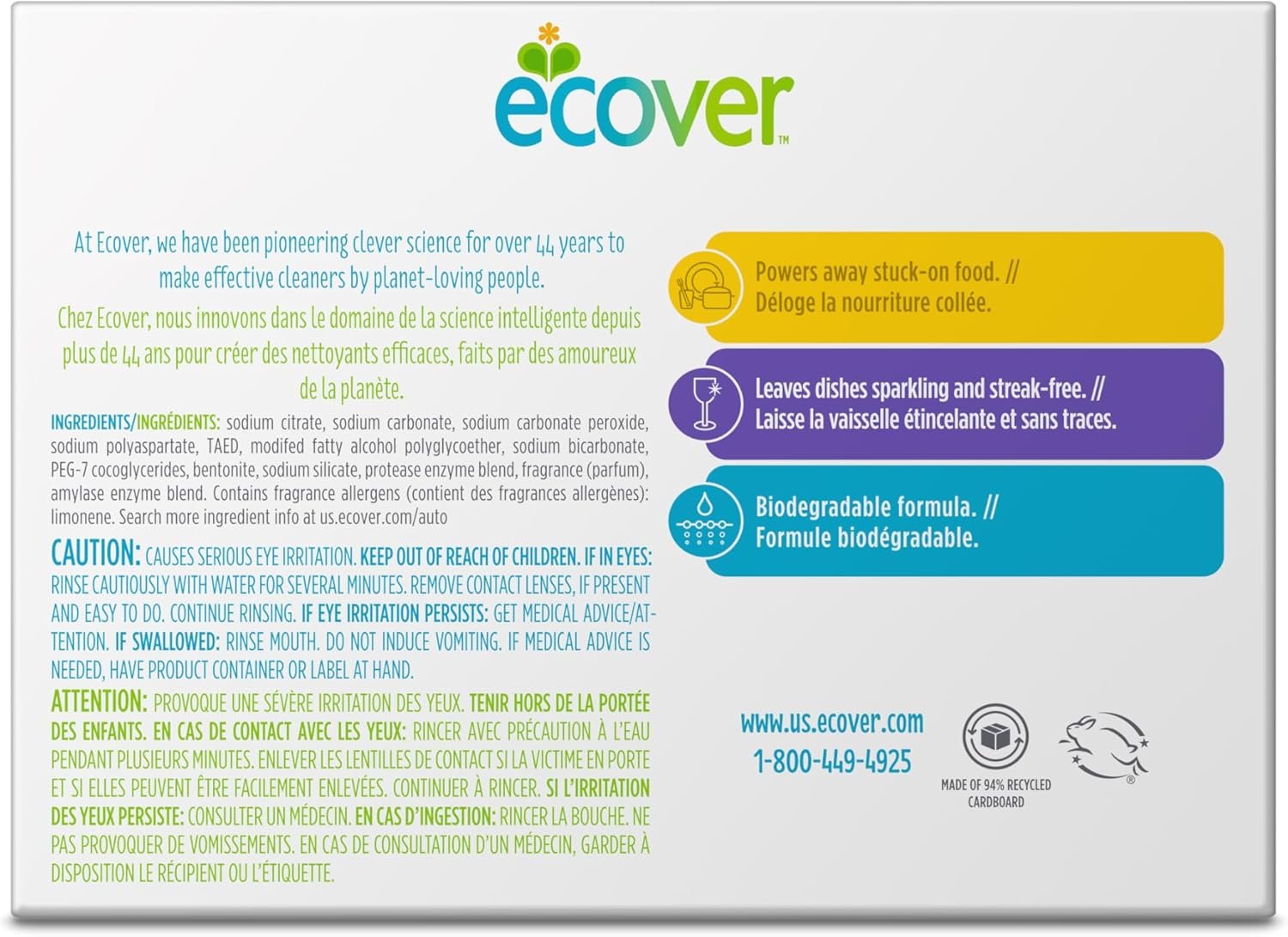 Customers appreciate the dishwasher detergent for its eco-friendly ingredients and lack of toxic smell. They find it effective in cleaning dishes and glasses without leaving much residue. Many customers appreciate the value for money and residue removal. However, some have mixed opinions about the plastic packaging and quality.