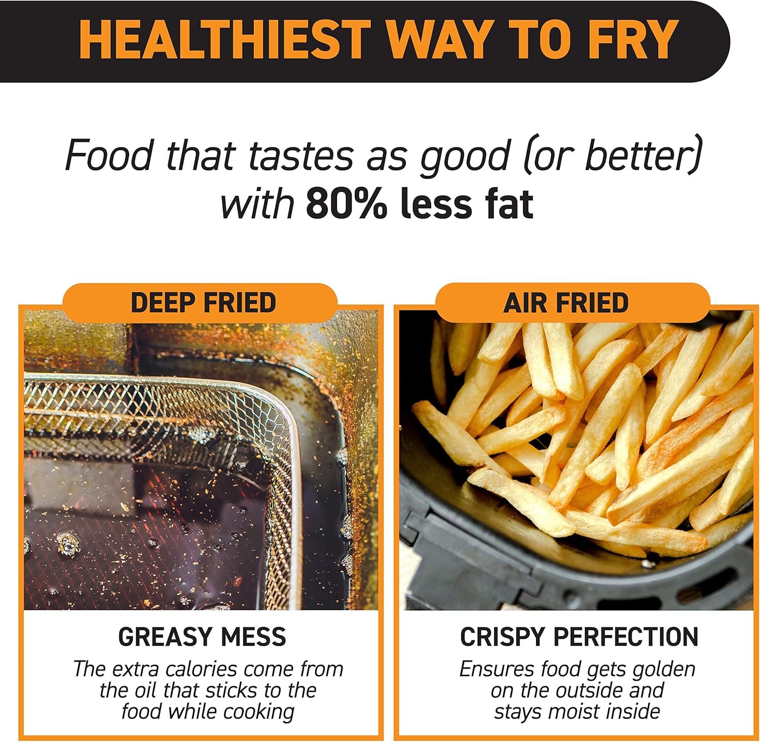 HEALTHIEST WAY TO FRY – All of the flavor and none of the guilt! Fat removal technology in the air fryer basket removes up to 90% of fat through the cooking process