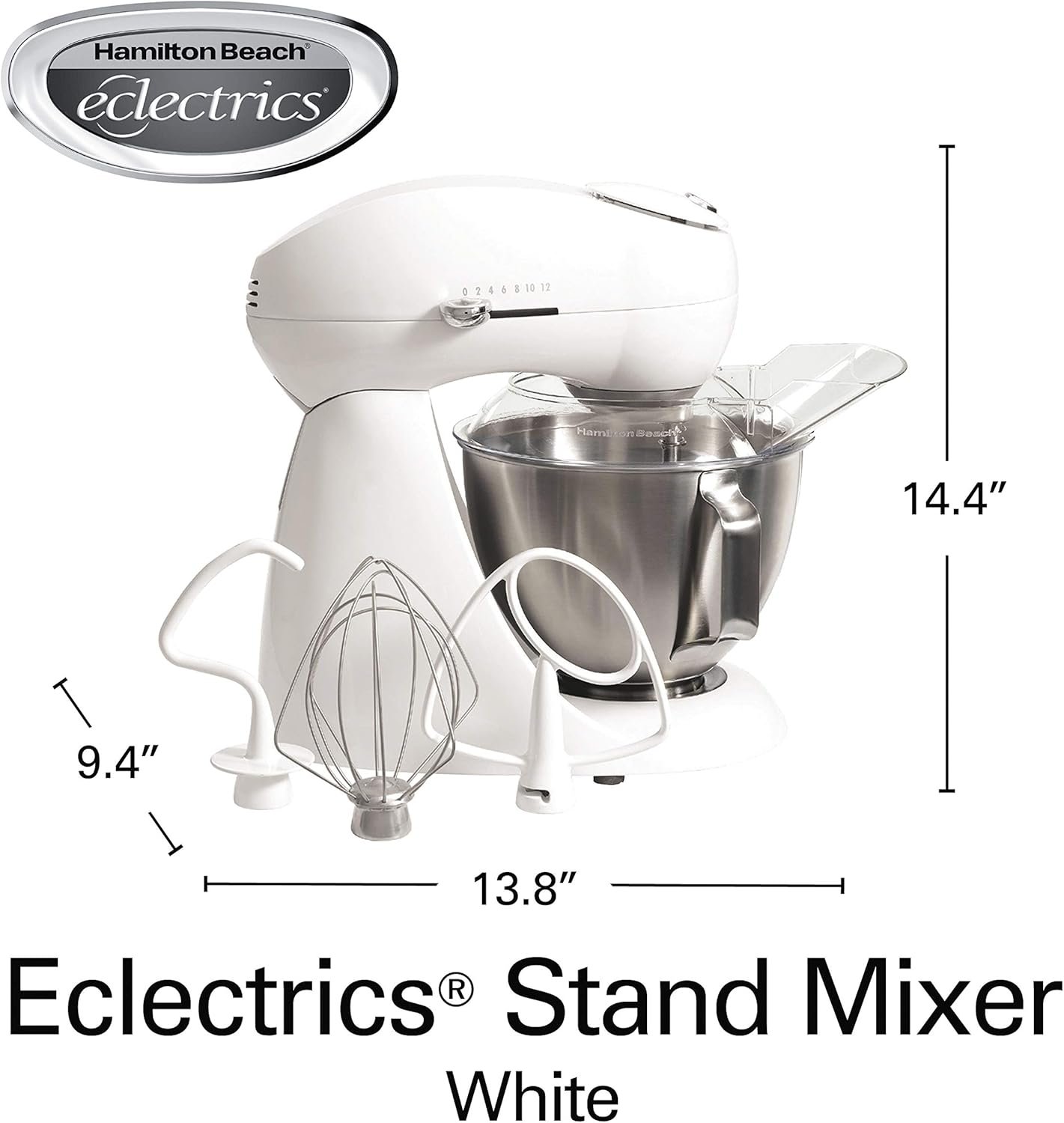 12 speed settings: Hamilton Beach eclectrics stand mixers let you go from a slow stir to a fast whip, excellent for mixing anything from sticky bread dough to light whipped cream.