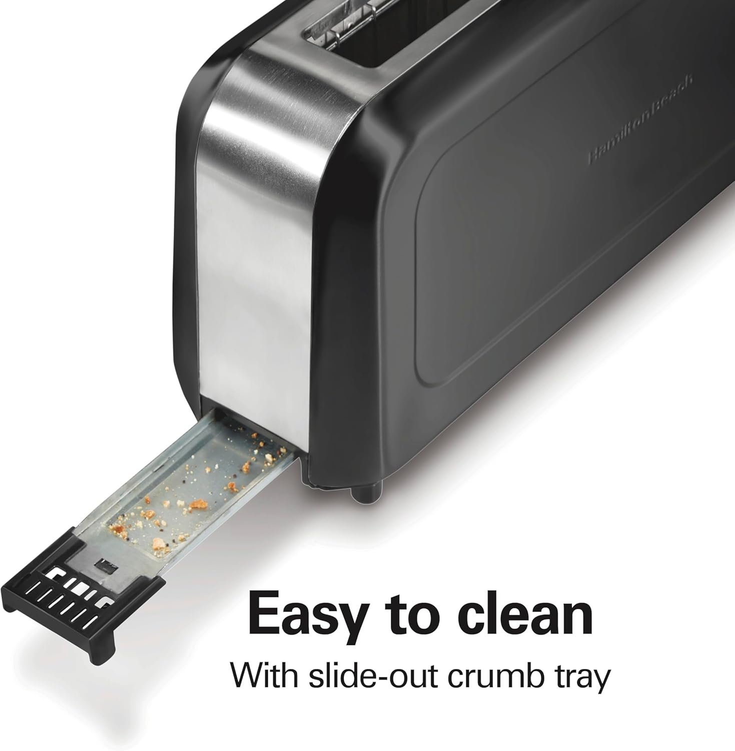 The Hamilton Beach® Long-Slot Toaster has an extra-long, extra-wide 10″ slot with self-centering bread guides to evenly brown 2 regular slices or 1 long slice of bread. The toaster has bagel and cancel buttons and a slide-out crumb tray.