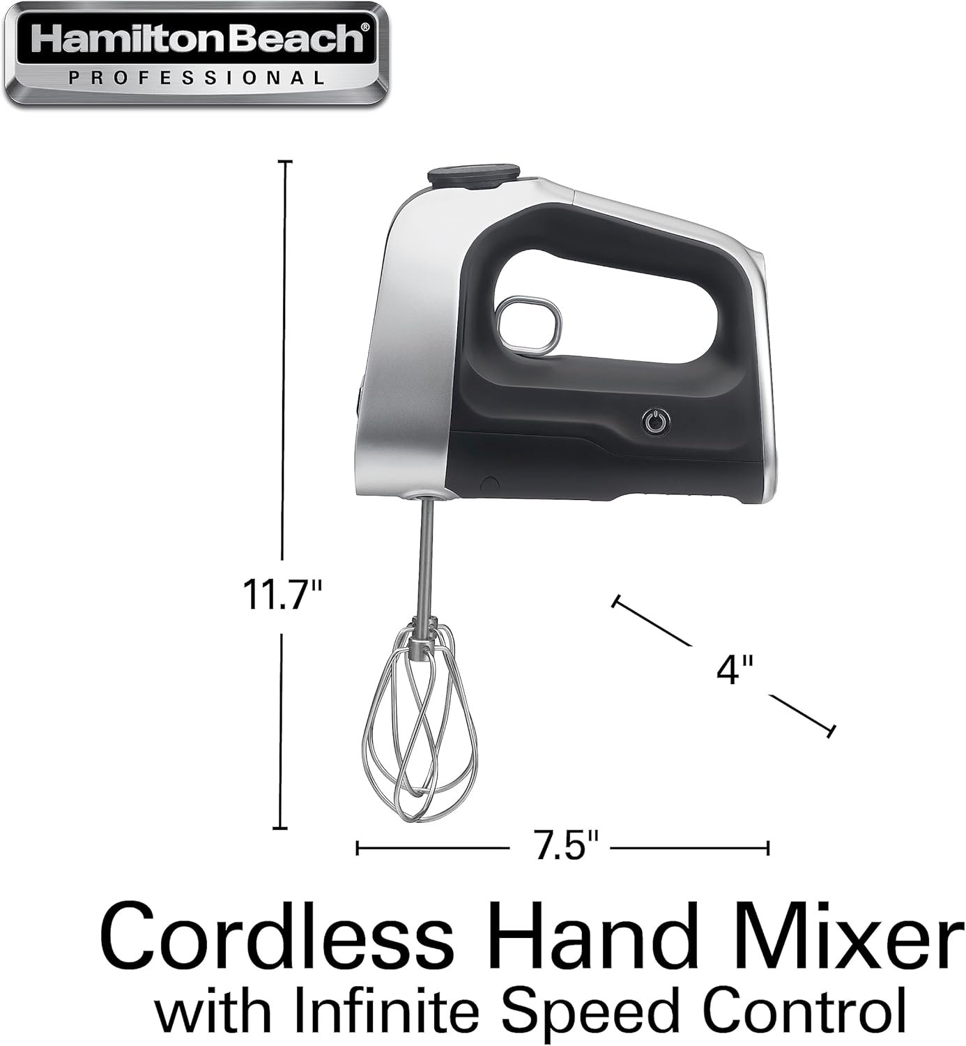 The Hamilton Beach® Professional Cordless Hand Mixer with Infinite Speed Control gives you cordless flexibility, and its infinite speed dial provides maximum mixing control. Includes 2 wire beaters, whisk, snap-on storage case and charging cord.
