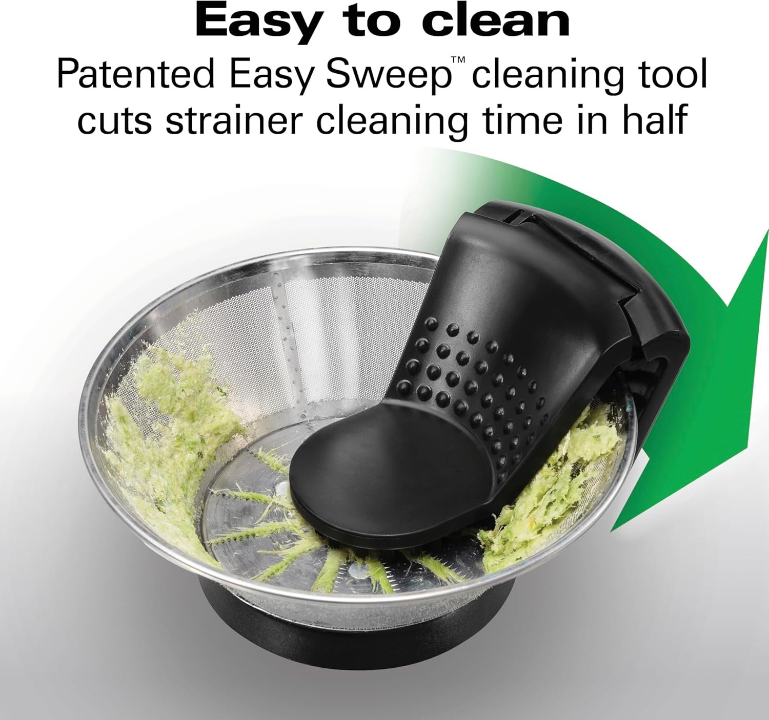 EASY TO CLEAN — PATENTED EASY SWEEP CLEANING TOOL. The Easy Sweep cleaning tool sweeps the strainer clean in one simple motion, cutting the strainer cleaning time of this juicer machine in half.