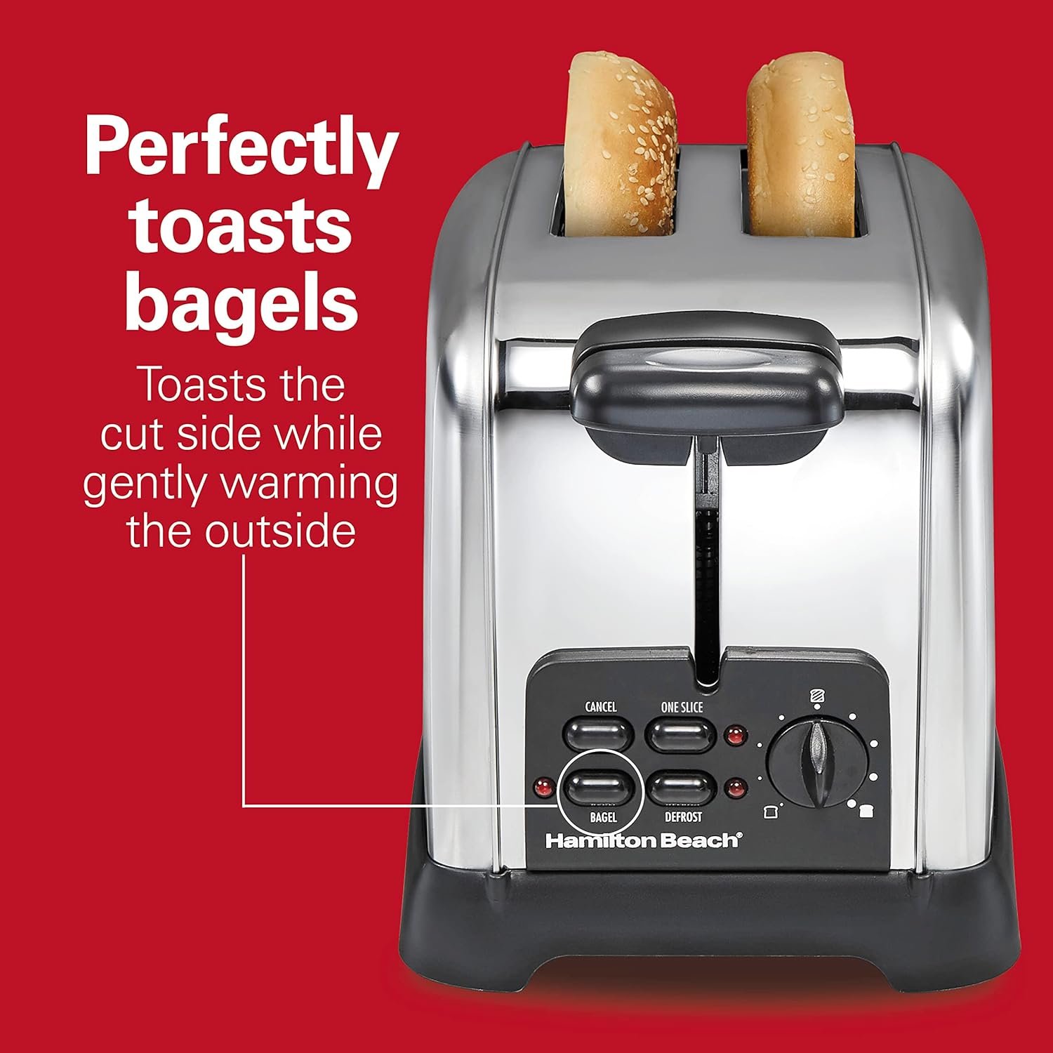 The Hamilton Beach® Classic Stainless Steel 2 Slice Toaster with Sure-Toast™ technology evenly toasts both sides of bread, even when toasting a single slice. Includes bagel and defrost functions along with Toast Boost for removing small slices.