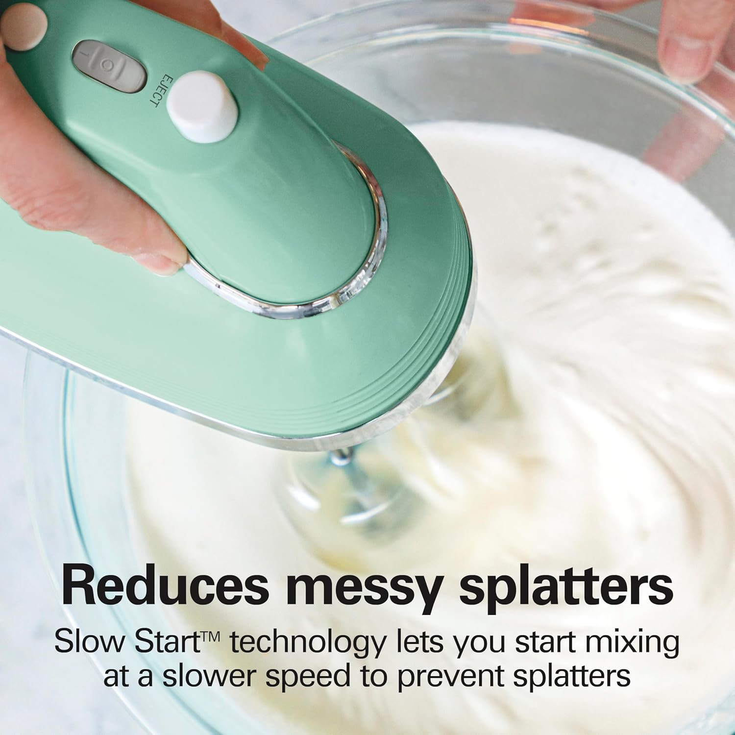 SLOW START TECHNOLOGY GRADUALLY INCREASES MIXING SPEED. Prevent clouds of flour or splatters of batter by starting slow. This electric hand mixer’s starting speed is nearly half as slow as a traditional mixer, so you can add ingredients gradually.
