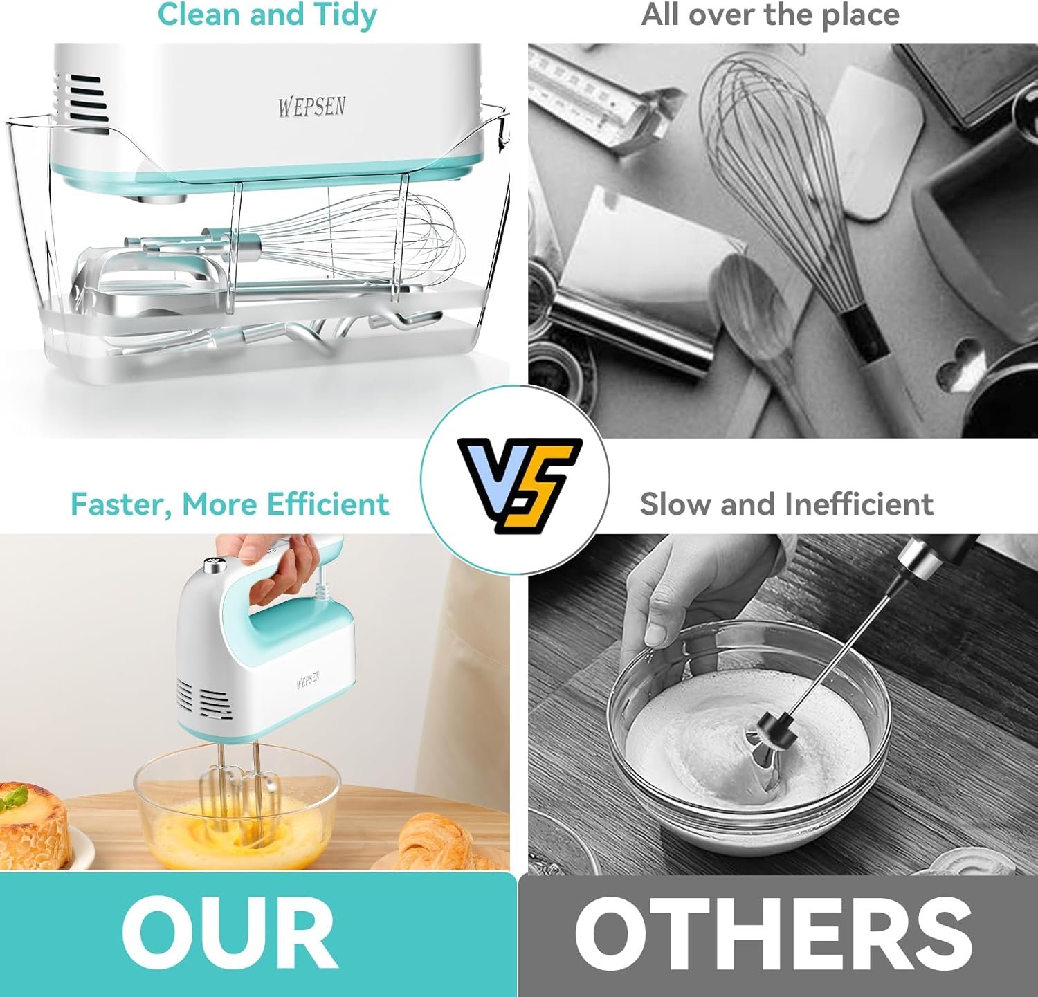 【Easy to Store】Upgraded electric mixer has snap-on storage and can store 6 stainless steel attachments or other small things. Reducing the possibility that the attachments are lost or misplaced. Help us keep the kitchen table clean and tidy.