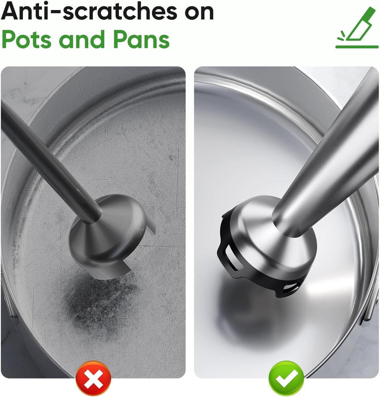Protect Your Cookware: This immersion blender handheld has a bell shaped base and food-grade nylon blade guard to protect your pots and pans from scratches and extend the life of kitchen tools. It also can prevents splatter to keep your clothes and kitchen clean