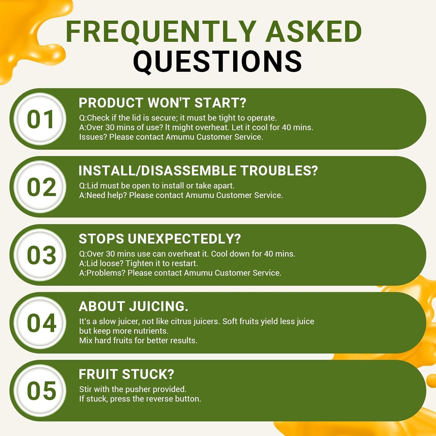 ✔[250W Powerful Extraction]- AMZCHEF SJ-036 Juicer adopts cold-press masticating technology, equipped with 250W strong power motor to provide super power for the auger, through the multi-stage sub-cutting crushing and squeezing process, so that the juice in each cell is extracted to maximise the juice yield and retain the original nutrients.