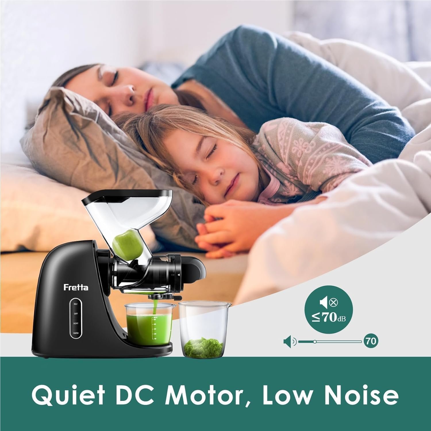 Powerful Yet Quiet DC Motor: Fretta uses a sturdy 200W DC motor to power their masticating juicer equipment. Its low-speed, high-torque design silently extracts deep nourishment from your favorite fruits and vegetables while running at low RPM. Enjoy a quiet juice session with noise levels around 70 dB