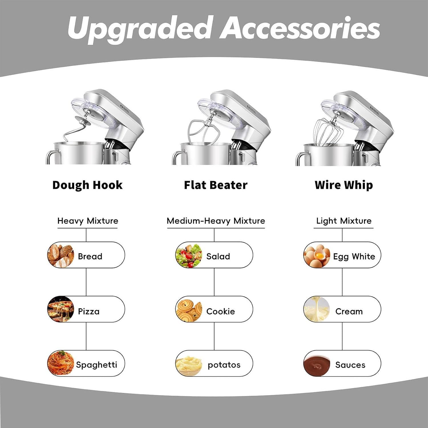 900W High Performance Motor: Our stand mixer is equipped with a 900W motor, upgraded motor has higher stirring efficiency and can fully mix all the ingredients in the bowl and easily complete the mixing of bread dough, thick batter and egg whites