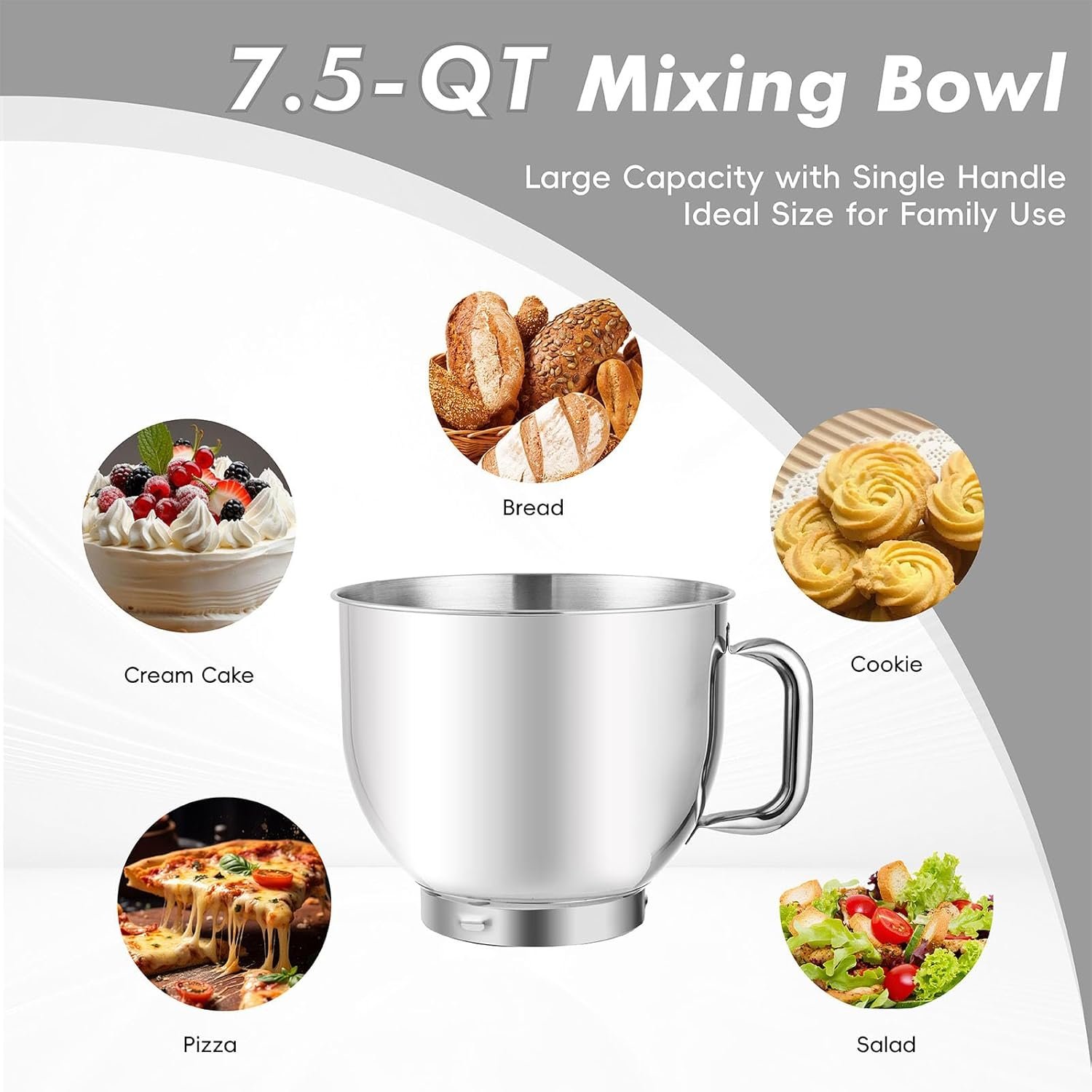 7.5QT Mixing Bowl with Handle: This kitchen electric mixer with a single-handled stainless steel bowl makes it easy to handle and mix various ingredients, suitable for family gatherings and parties, and produces delicious dishes that will delight your family and friends