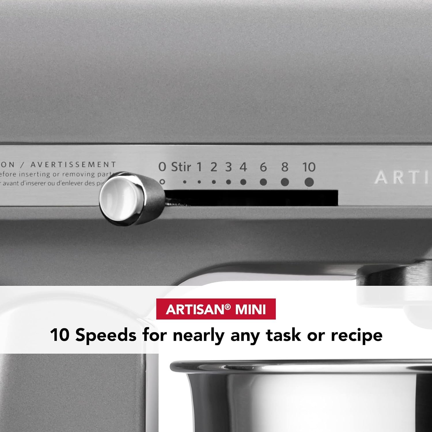 Lighter. Smaller. Just as Powerful.* When you still need the power but don’t quite have the space, the KitchenAid® Artisan® Mini Tilt-Head Stand Mixer can whip up the recipes you love without taking over your kitchen counter. This durable tilt-head stand mixer was built to last, and can mix up to 5 dozen** cookies in a single batch. It features 10 speeds to gently knead, thoroughly mix and whip ingredients for a wide variety of recipes. Whether you’re craving fresh guacamole, gently shredded pulled pork or a single, flavorful pan of meatloaf, the Artisan Mini can help you create a variety of small-batch, hand-crafted possibilities. Get creative and make more with your mixer with over 10 optional hub-powered attachments***, from food grinders to pasta makers and more. *Compared with the KitchenAid® Classic™ Stand Mixer. **Using the flat beater; 28g dough each ***sold separately.