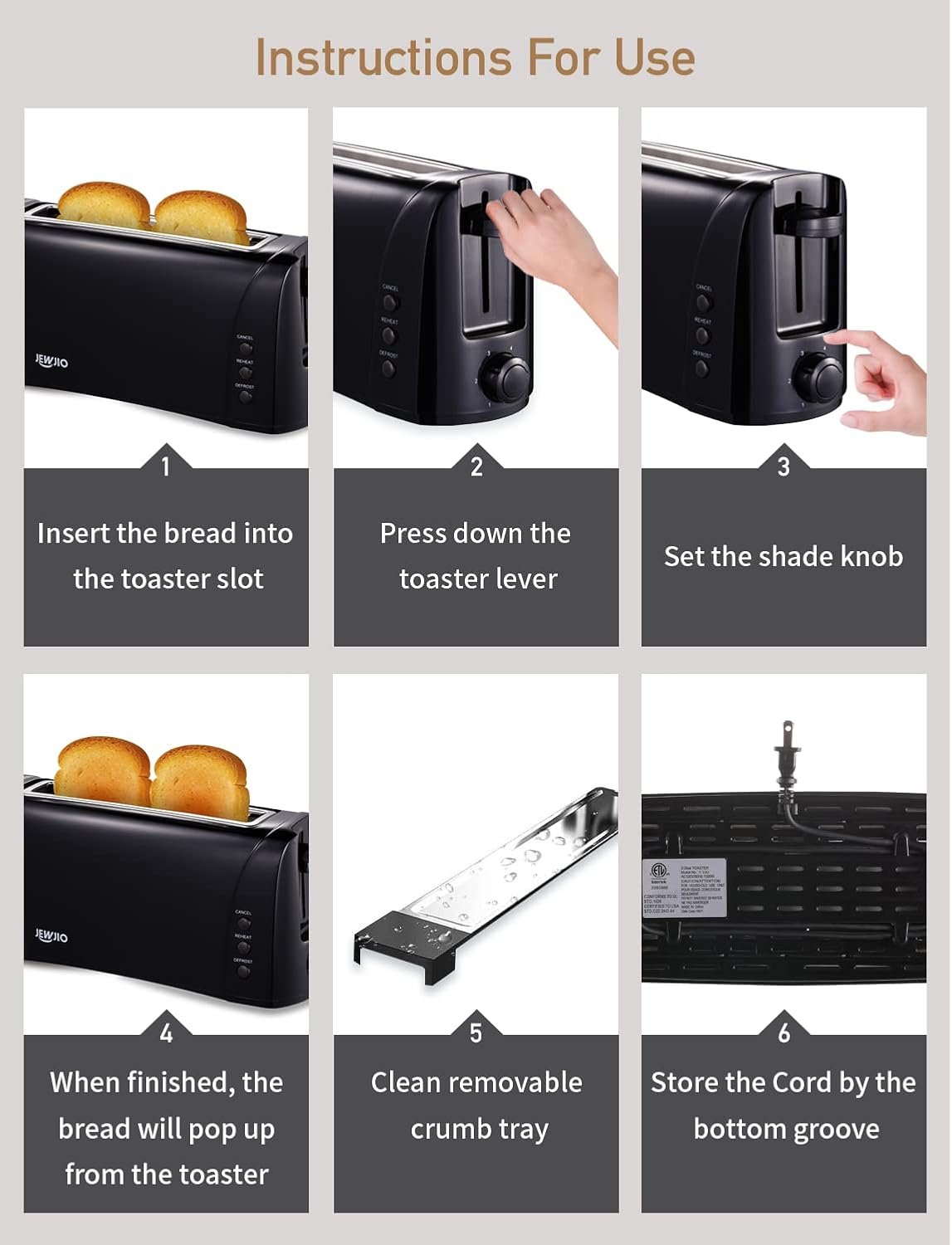 🍞【EASY TO CLEAN & STORAGE】The bottom of the compact toaster extra wide has a sliding-out crumb tray in which all the bread crumbs are collected (the tray can be washed directly). An Anti-sticking design guarantees the 2 slices long toaster can stop toasting automatically when time is finished. There is a storage space for the power cord at the bottom side, which is easy to store. (Tips: Before use, without inserting bread slices, heat the product at least 3 times at the maximum setting. )