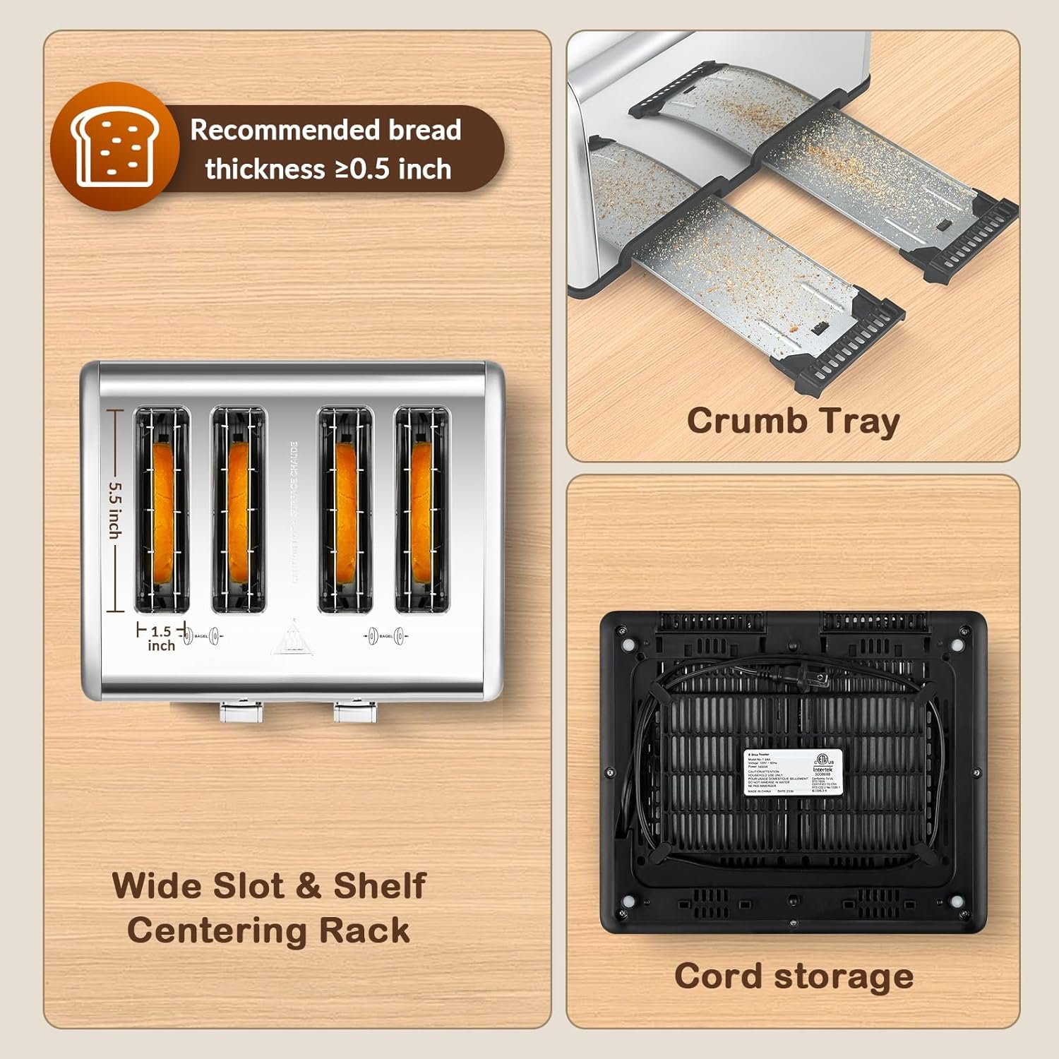 【Easy to Clean and Maintain】: The non-stick, food-grade stainless steel slots and removable crumb tray make cleaning this toaster a breeze. Spend less time maintaining your appliance and more time enjoying your perfectly toasted bread.