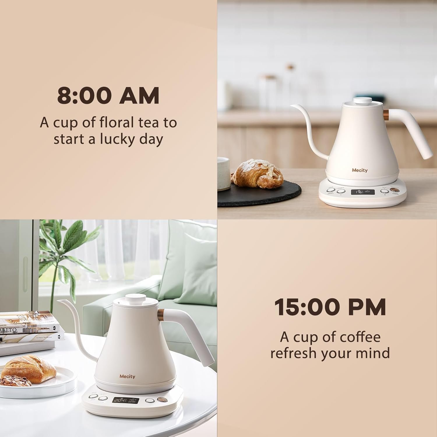 Professional Electric Kettle For Coffee and Tea: Mecity electric kettle is so professional that allows you to select the ideal temperature from 100 to 212℉. Tea-leaves and coffee beans smells and tastes different in different temerature, Mecity water kettle helps you to be a pro, now you can coax out your own typical aroma like floral and fruits in brewing your beverage