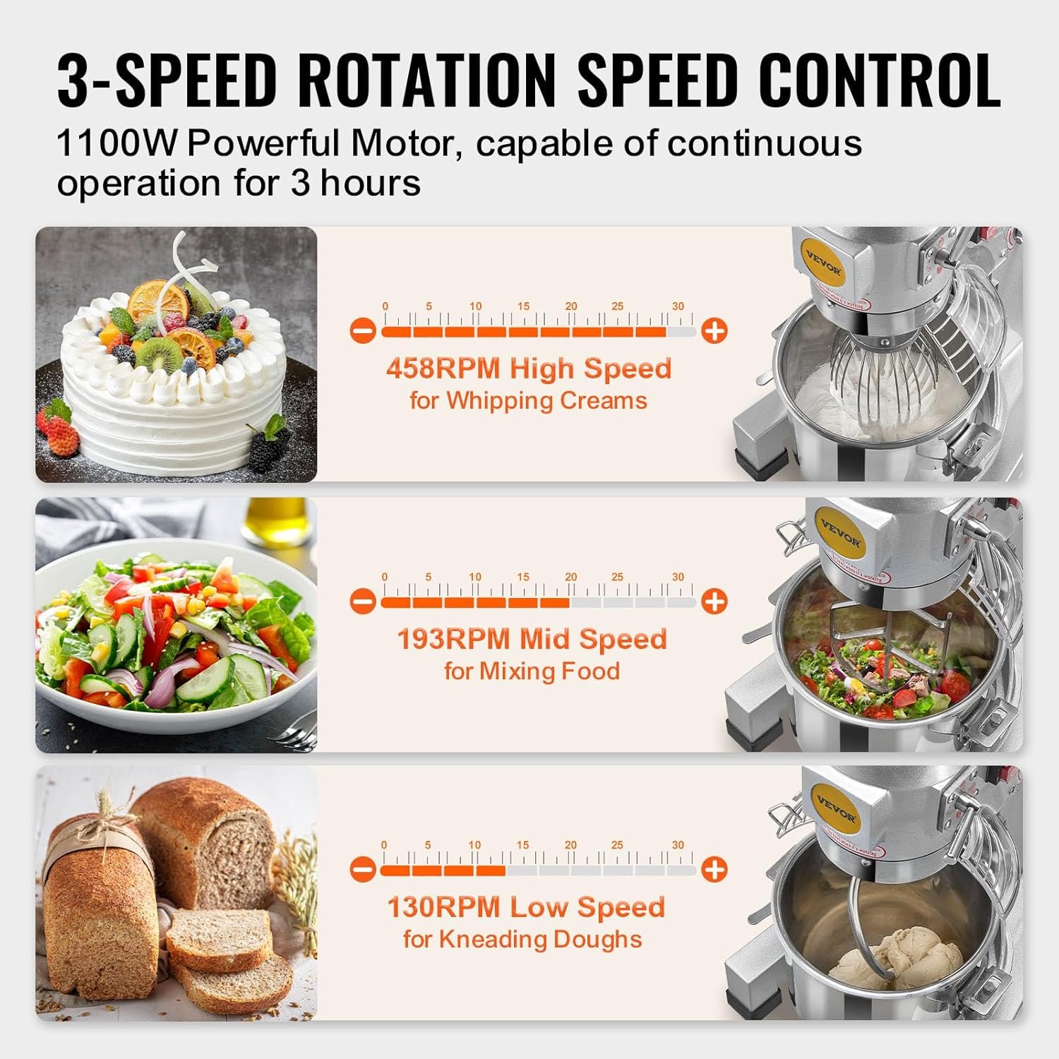 VEVOR Commercial Mixer, Commercial Food Mixer 10/15/20/30 Qt Stainless Steel Bowl,Commercial Stand Mixer with 3 Speeds Adjustable